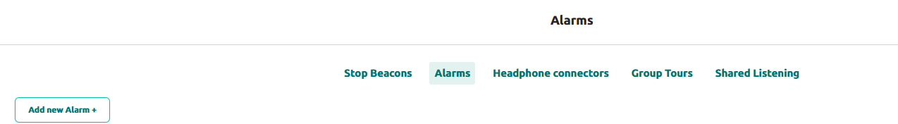 Adding a beacon to use as an Alarm, to start a Group or Shared Listening tour, or to activate Bluetooth pairing is simple. Navigate to the Hardware -> Beacons page. Here, navigate to the type of Beacon you want to add, and press the button to add a Beacon of that type.