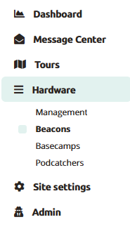 Adding a beacon to use as an Alarm, to start a Group or Shared Listening tour, or to activate Bluetooth pairing is simple. Navigate to the Hardware -> Beacons page. Here, navigate to the type of Beacon you want to add, and press the button to add a Beacon of that type.