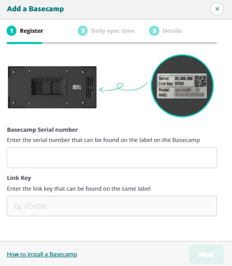 Allows you to add a new basecamp to your site through the serial number and link key.