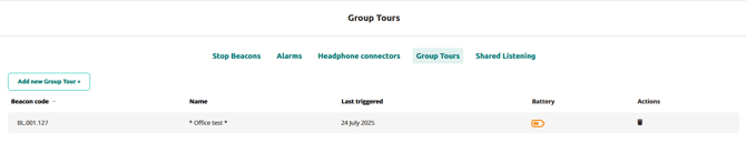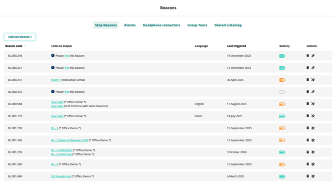 The Beacon list shows the details of all Beacons you have linked to the site. It is made up of different sections, split up by the purpose you have assigned to the Beacons.