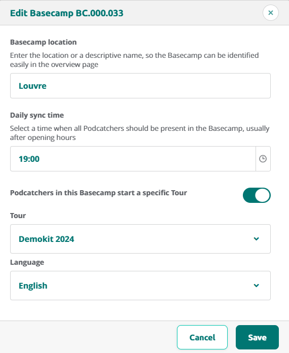 Klik op de toggle om een specifieke tour te starten voor de Podcatchers in de gekozen Basecamp.