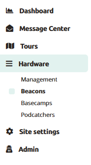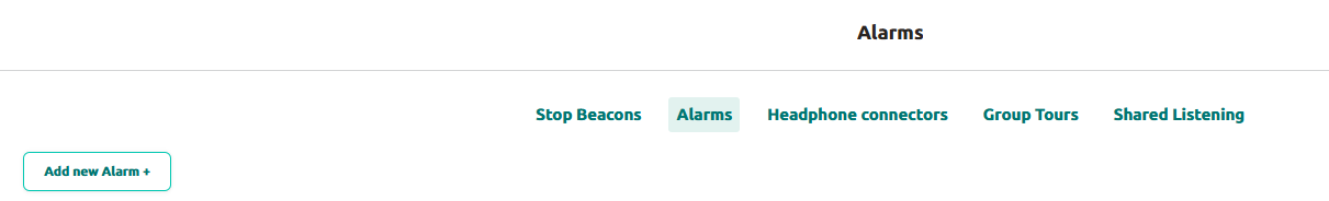 Om Beacons met speciale functies toe te voegen (Zoals een Alarm, Bluetooth Pairing, start van een Group Tour of Shared Listening tour) ga je naar de Hardware -> Beacons pagina. Hier heb je het Beacon Overzicht, en kun je via de knoppen de verschillende soorten Beacons bekijken.