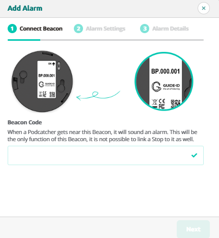 Beacons zijn nodig voor het activeren van content op Podcatchers en de PWA. Door de Podcatcher dichtbij de Beacon te houden, krijgen bezoekers het verhaal te horen van het object waarbij de Beacon is geplaatst. Door een Beacon toe te voegen aan een stop, wordt deze gekoppeld aan de inhoud. Er is altijd een Beacon nodig bij de eerste stop om een tour vanaf het begin te starten. Voor elke taal is een aparte Beacon nodig.