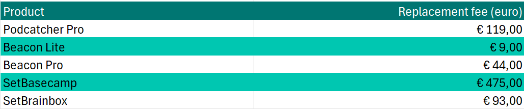 In geval van verlies, diefstal of ernstige beschadiging van de hardware zijn wij genoodzaakt de vervangingskosten in rekening te brengen die je in onderstaande tabel kunt vinden (prijzen zijn per stuk, ex. BTW).